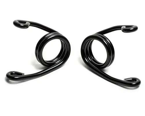 A pair of black hair springs for solo seats in old school style. The springs are winded in different strength, one for left and one for right to prevent the seat from moving sideways.