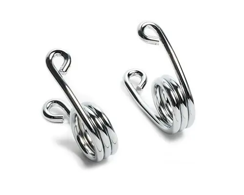 Zwei verchromte Haarfedern im Oldschool-Style zur Anbringung zwischen Solositzen oder anderen Sätteln und einer entsprechenden Halterung am Rahmen. Die Federn haben unterschiedliche Wicklungen, für rechts und links hinten unterm Sitz. Dies führt nicht nur zur verbesserten Optik, sondern verhindert, dass sich der Sattel unter Belastung zu einer Seite verdreht. Die Höhe an der breitesten Stelle bei den Ösen beträgt ca. 7,5 cm, die Breite ca. 9 cm, Drahtstärke ca. 6,5 mm. Die Ösen haben ca. 1 cm Öffnung zur Befestigung der Federn.