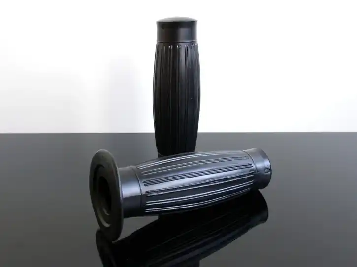 Grip set made of black hard rubber for motorcycles with 22mm handlebars. Very good grip and classic look thanks to the ribbed barrel style with edge! The grips have an opening for ox-eye indicators or bar end mirrors of approximately 5 mm, and can be cut open if necessary. The scope of delivery includes a pair of handles. As is usual with motorcycle grips, the inner diameters of the grips differ for the left and right.
