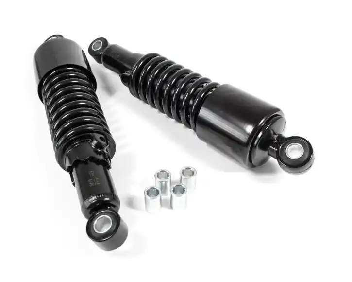 A pair black custom shocks to lower the bike. The length of the shock absorber is 11″ (28 cm) from hole to hole, the diameter of the mounting hole is about 12mm, 10mm bushings come with it. Attention, many Sportster models have 12.2 mm (1/2 „) diameter. Please check before ordering if it will fit your bike.