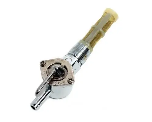 Chrome-plated fuel tap in oldstyle look for Harley-Davidson® models before 1975 or for custom tanks with 3/8″ NPT connection, approx. 17 mm thread diameter (slightly conical). With good flow! Standard version with an On / Off / Reserve lever as well as a filter screen. The connection for the 8 mm fuel hose points directly downwards. Replaces OEM 62125-55B.