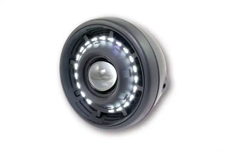 Matt black ellipsoid main headlight in a high-quality metal housing.