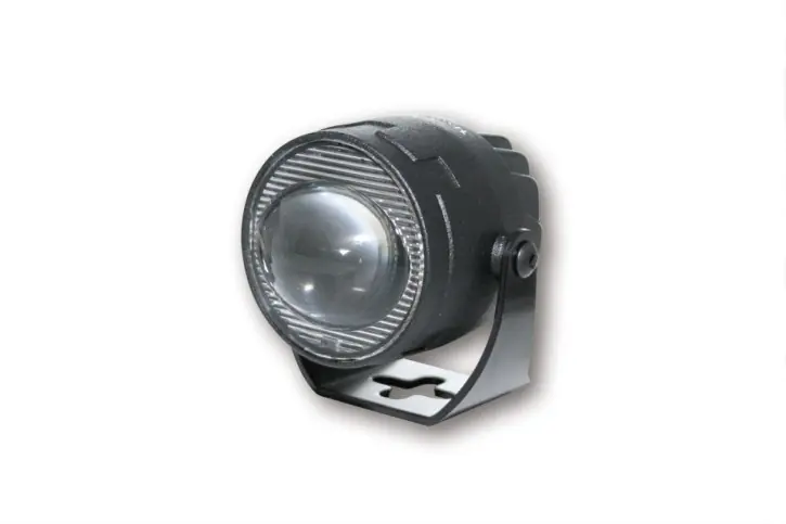 Kleiner, leistungsstarker Abblendscheinwerfer mit 2 Power-LEDs (à 8 Watt) in einem matt-schwarzen Aluminium-Gehäuse mit runder Linse, eingefasst in eine stabile Halterung aus Stahl. Die LED-Technik und der verwendete Einsatz erzeugen ein symmetrisches, helles Licht für eine optimale Wahrnehmung von Bikern durch andere Verkehrsteilnehmer.