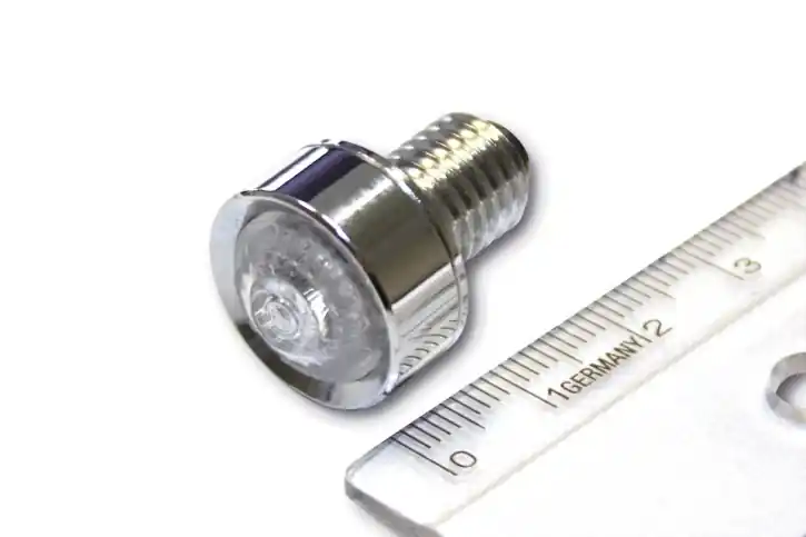 Rücklicht mit einer Power-LED und klarem Glas, eingebettet in ein rundes Aluminium-Gehäuse, E-geprüft.