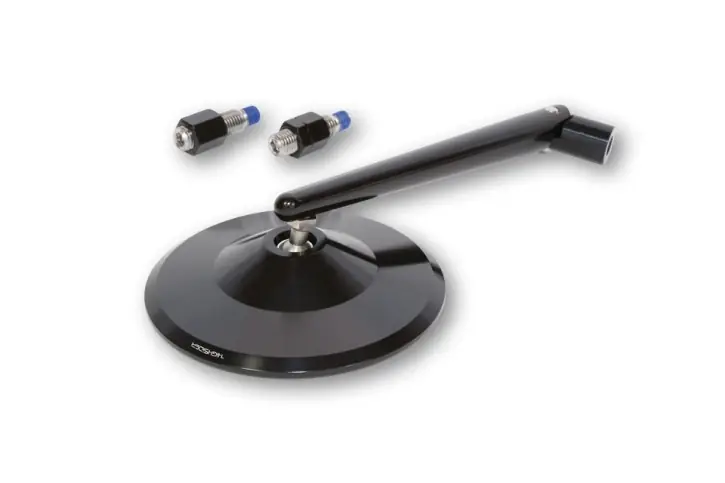 Finely crafted universal mirror with a round head in black anodized aluminum and adjustable arm.