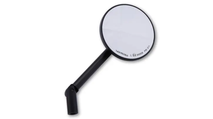 Edler, CNC-gefräster Universal-Spiegel mit einem runden Kopf aus eloxiertem Aluminium in Schwarz matt. Dank der Verwendung eines zweiten Gelenks am Stiel ergeben sich zusätzliche Einstellmöglichkeiten für deine Sicherheit. Das leicht getönte und gewölbte Spiegelglas bietet einen optimalen Blendschutz. Für linke und rechte Seite verwendbar.