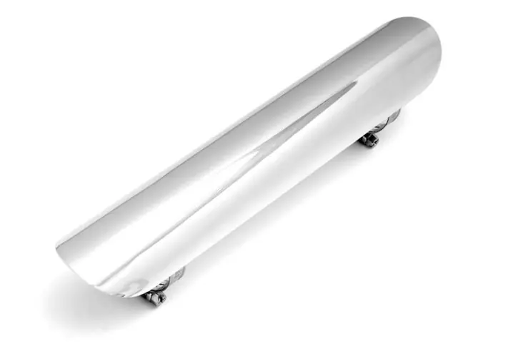 Hitzeschutzblech für Auspuffrohre oder Krümmer mit 1-¾“, 45 mm Durchmesser. Verchromtes 1 mm Stahlblech mit ca. 305 mm Länge und 55 mm Breite. Wird mit zwei mitgelieferten SS 400 Edelstahl-Schlauchschellen befestigt, die zwischen 25 bis 50 mm einstellbar sind.