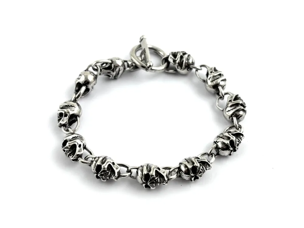 Cool biker jewelry for everyone who loves individuality and wants to stand out from the crowd. Here is a delicate bracelet made of precious silver-plated copper, handcrafted from many small skulls. A statement of individuality and biker style.