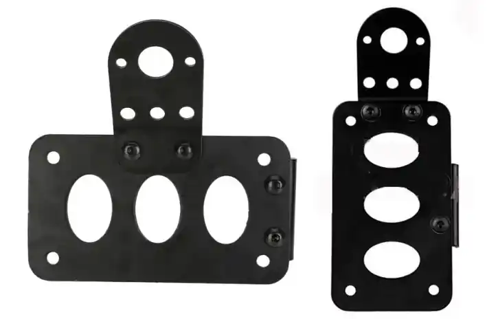 Der schwarz pulverbeschichtet Kennzeichenhalter kann sowohl horizontal, als auch vertikal montiert werden.