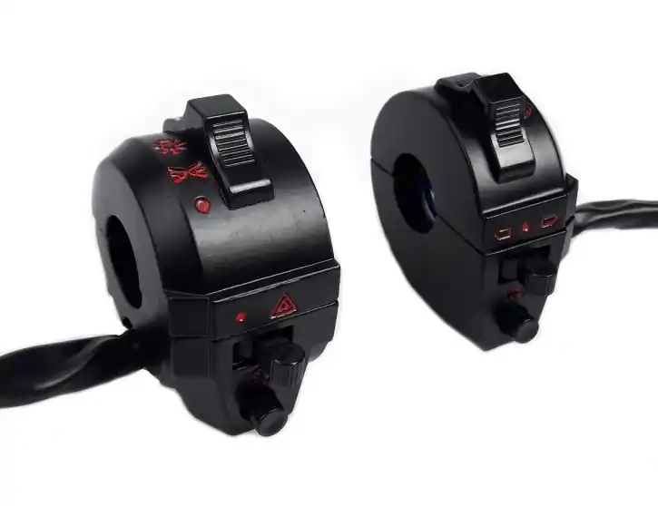 Formschönes Lenkerarmaturen-Set mit Blinker-, Fernlicht-, Warnblinker-, Licht-, Anlasserschalter und Hupe.