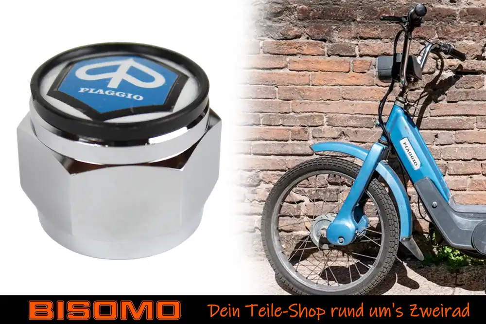 Neue Lenkkopf-Mutter kompatibel mit Piaggio Vespa Citta und Ciao. Die Lenkkopfschraube ist mit dem typischen Logo versehen – blaue, sechseckige Wabe mit stilisierter, weißer Wespe – und hat einen Durchmesser von ca. 21mm. DasLenkkopflager ist aus verchromten Stahl gefertigt, was sie widerstandsfähig gegen Korrosion macht. Der Gewindedurchmesser beträgt 26mm.
