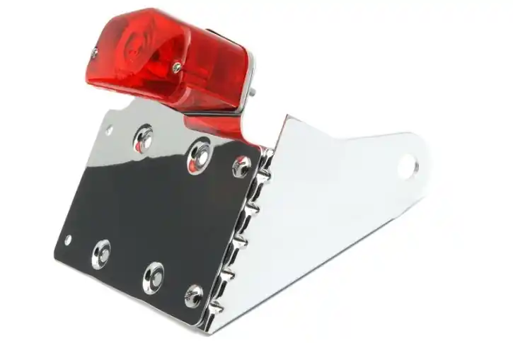 Classical taillight with side mount license plate frame. Perfect to build custombikes. Chrome-plated metal mounting. Including bolts, license plate frame and bulb. 5 / 21 watt bulb for stop light, backlight and license light.