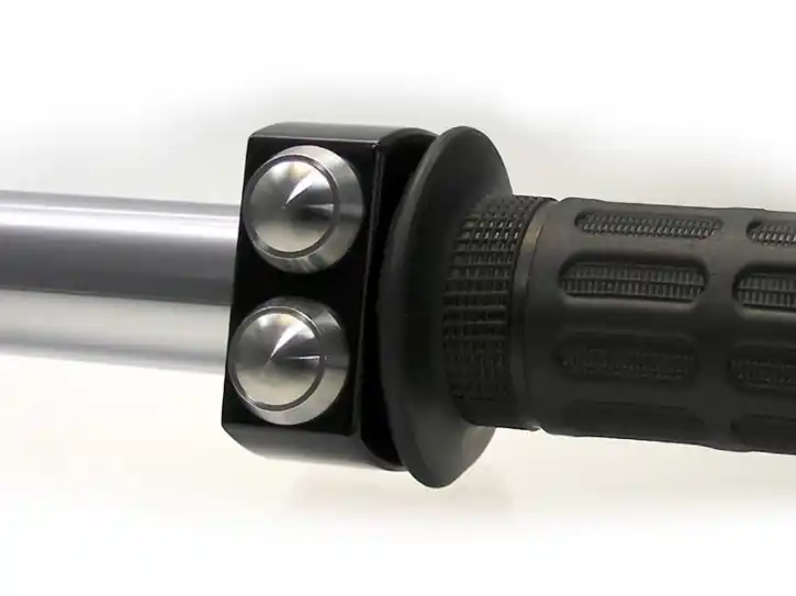 The casing is made from CNC machined billet aluminium and available in mirror polished or reflective black finished surface respectively. The compact design casing permits mounting two or more units on one handle bar. Each unit is equipped with two or three push-buttons in black or stainless steel. Different looks matching or contrasting the casing can be combined freely. One built-in M5 stainless steel mounting screw ensures secure and stable clamping of the push-button control to all handle bars. The push-buttons are of high quality, very robust design and vibration- and spraywater-proof (IP65). The adequate size and ergonomic pressure point (easy, mechanical detent) provide for a definite actuation sensing – even when operated with gloves. This feedback allows shifting without the need to check the operation. Each push-button is equipped with two terminals for an easy optional circuit layout with only one or two cables. The internal