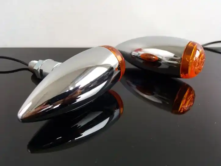 2 x Bullet Light-Blinker mit verchromtem Metallgehäuse. Die kleinen Fahrtrichtungsanzeiger sind deutlich kleiner als die voluminösen Serienblinker von Harley-Davidson oder von japanischen Motorrädern. Die Befestigungsschraube ist hohl gebort, so kann das Kabel unsichtbar verlegt werden. Das zöllige Gewinde hat etwa 10 mm Durchmesser. Mit E-Prüfzeichen, keine Eintragung in die Fahrzeugpapiere notwendig. Der Preis bezieht sich auf ein Paar Blinker.