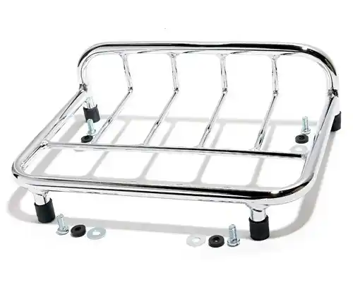 Formschöner und praktischer hochglanzverchromter Gepäcktrager zur Montage auf einem Topcase oder anderen ebenen Flächen wie Alukoffer, Beiwagen oder Trike-Blechen. Üblich waren solche Träger für Harley Davidson® FLH und FLT Modelle von 1980-1991.