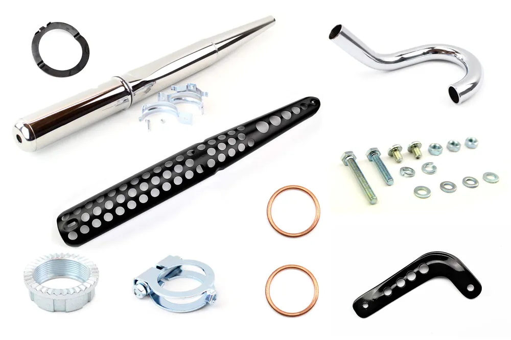 [Paket] SET Enduro Auspuff 32mm Durchmesser + Krümmer + Teile + Hitzeschutz + Haltestrebe kurz für Simson S51, S53, S70, S83 Ausverkauf