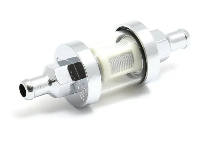Chrome-plated fuel filter with sight glass. High flow filter – can be unscrewed for cleaning. The hose connections have a diameter of 5/16″ (approx. 8 mm). Total length approx. 82 mm.