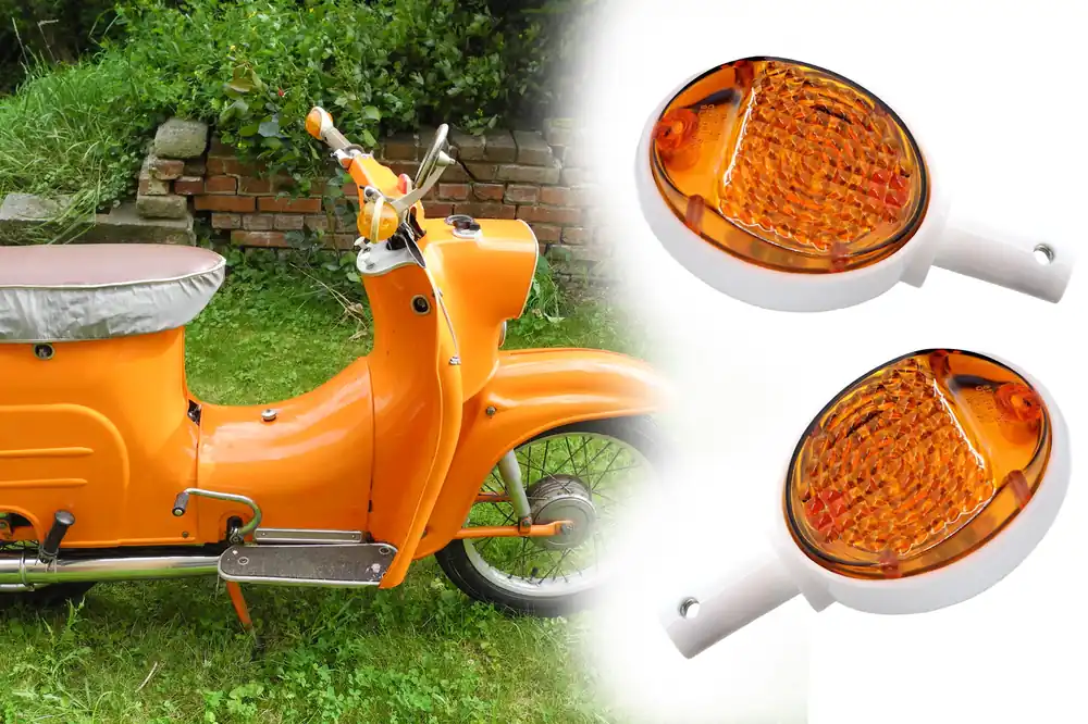 Preis Gesenkt 2x Blinkleuchte Ochsenauge, Blinker mit E-Zeichen für Simson KR51, SR4-2, SR4-3, SR4-4, MZ ES Trophy 175 250, Gehäuse weiß