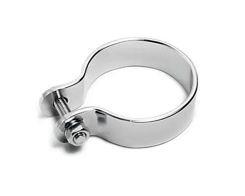 Universal-Schelle zur Klemmung eines Auspuffendrohrs auf dem Krümmer. Die verchromte Schelle hat einen Innendurchmesser von etwa 50 mm (2″). Geklemmt wird mit einer 6 mm Schraube.