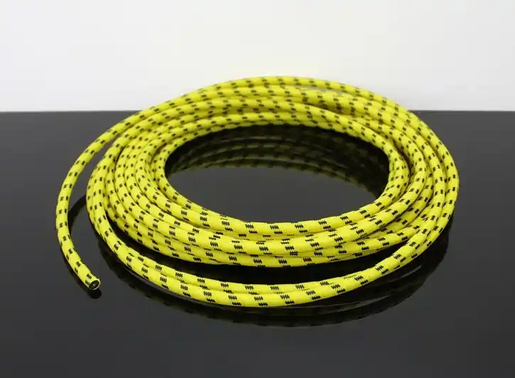 The cotton fabric encases a modern PVC cable with fine copper braid.