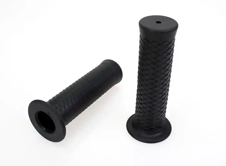 Griffset aus schwarzem Hartgummi für Motorräder und Chopper mit 22mm Lenkerdurchmesser. Das Schuppenmuster sorgt für guten Grip und eine lässige Optik. Die Griffe haben eine Öffnung für Ochsenaugenblinker oder Lenkerendspiegel von ca. 4 mm, die bei Bedarf aufgeschnitten werden kann. Im Lieferumfang ist ein Paar Griffe enthalten. Wie bei Motorradgriffen üblich, unterscheiden sich die Innendurchmesser der Griffe für links und rechts.
