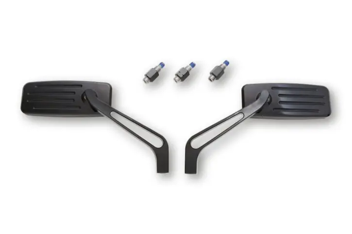 High-quality, CNC-milled mirror with a rectangular head made of black anodized aluminium. Incl. one extra adapter M10 x 1.25 mm with L/Hand thread, e.g. Yamaha.