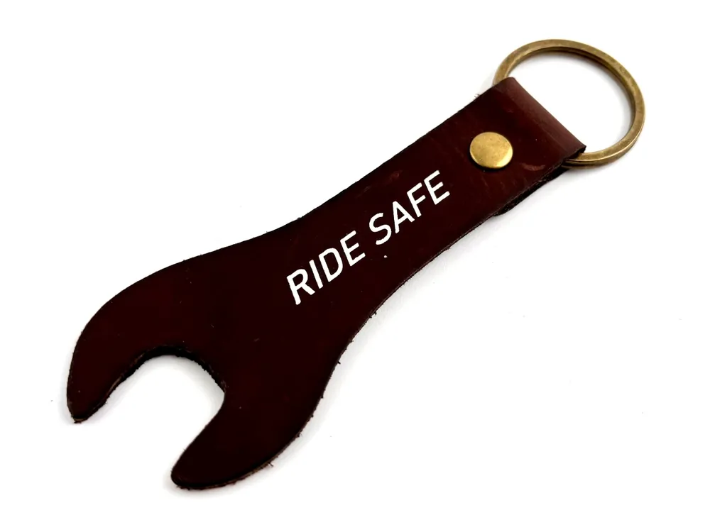 This genuine leather key ring combines functionality with a cool look of a spanner tool. The thick leather is robust and gains more character and patina with every ride. The sturdy metal ring keeps your keys safe and handy – whether ignition keys, garage keys, or house keys. And with its silver “Ride Safe” print, it’s designed to give you the luck you need on your bike rides.